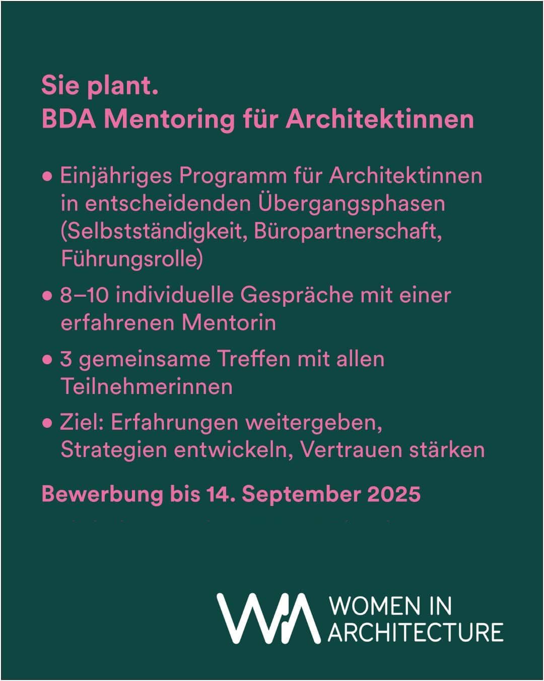 Das Programm ist eine Initiative der BDA-Landesverbände Baden-Württemberg und Hessen. Es richtet sich an Architektinnen vor und in entscheidenden beruflichen Übergangsphasen – ob beim Schritt in die Selbstständigkeit, in eine Büropartnerschaft oder in eine Führungsposition. Über ein Jahr hinweg begleiten erfahrene Architektinnen ihre Mentees auf diesem Weg.