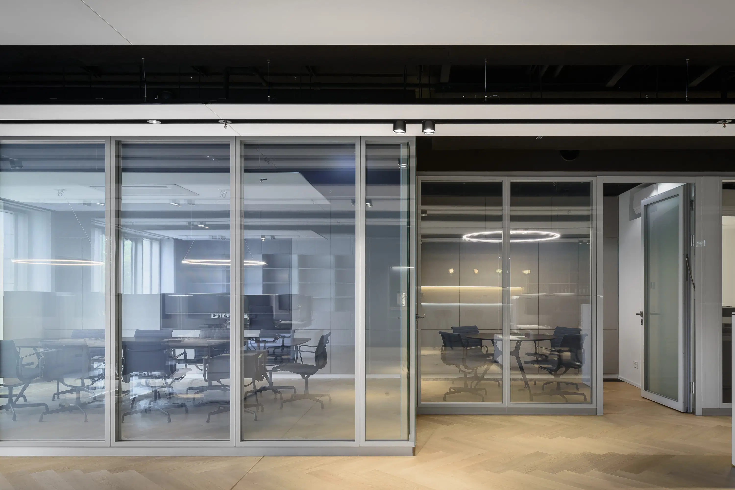 Ein großzügiges Eichenholz-Fischgrätparkett verleiht dem offenen Raum mit seinen gradlinigen und zeitgemäßen Ausstattungselemente ein sinnliches Flair. Weitere Eichenholzelemente, lackierte Einbaumöbel und -wände in abgetöntem Petrolblau und zartem Blaugrau sowie stoffbespannte Medienschrankwände in dezentem Graubeige differenzieren die Arbeitsbereiche atmosphärisch und zweckdienlich.Die doppelwandigen Ganzglaswände der Besprechungsräume erzeugen Großzügigkeit und Transparenz und erfüllen höchste Schallschutzanforderungen und feine Designansprüche. Der gewünschte Sichtschutz während Verhandlungen kann durch eine elektrisch dimmbare Sichtschutzfolie erreicht werden.