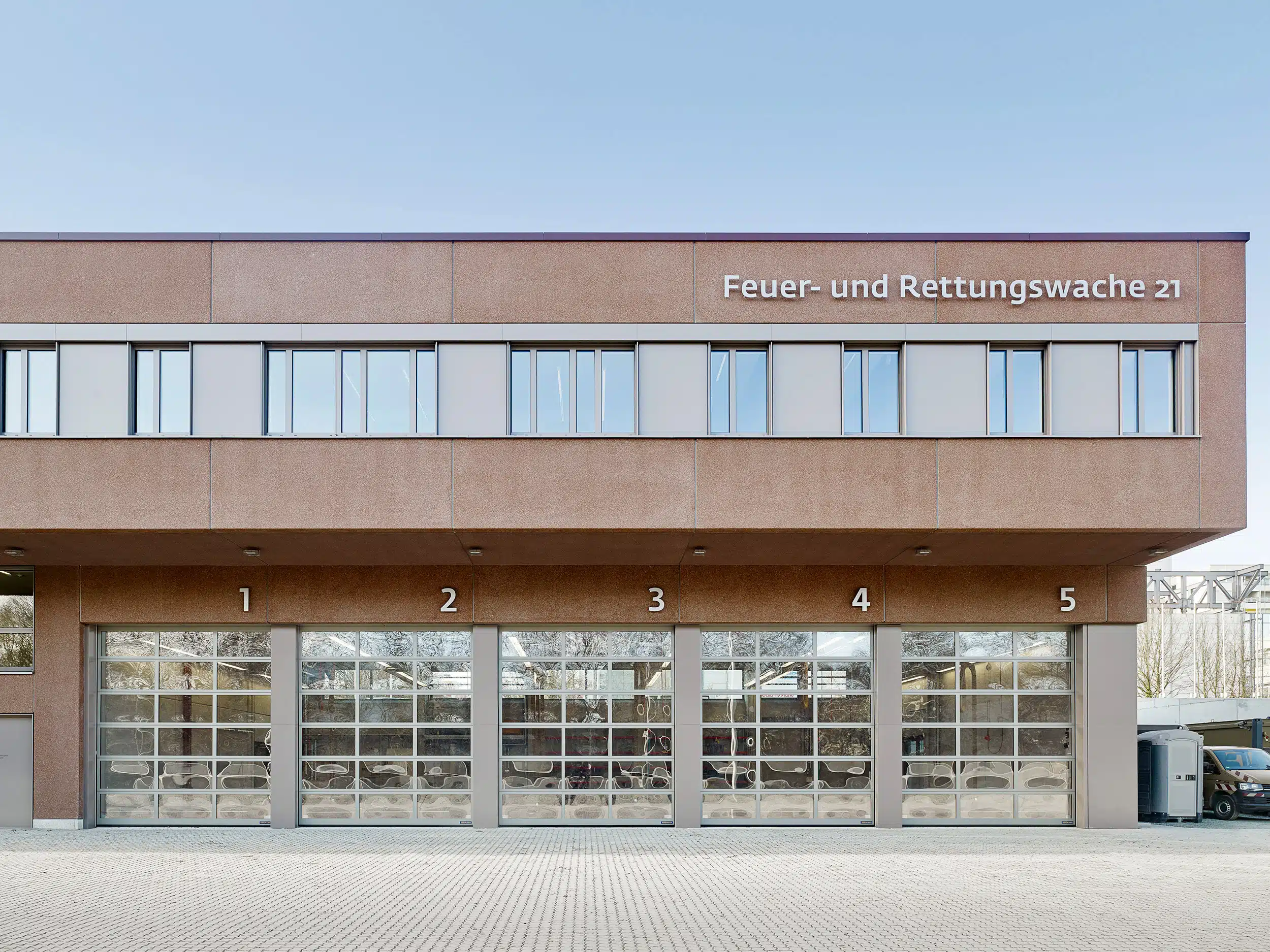 Die neue Feuer- und Rettungswache befindet sich am Rande des Nordwestzentrums auf einem engen Grünraumstreifen zwischen mehrspurigen Straßen. Der skulptural gegliederte Neubau macht sich die Topographie des Ortes mit 6m Höhenunterschied zunutze und ordnet die 2 Fahrzeughallen für fünf Feuerwehr- und drei Rettungsdienstfahrzeuge auf unterschiedlichen Niveaus an, die über eine Gebäudeumfahrt verbunden sind. Zwischen den beiden Hallen liegt das Treppenhaus, es verbindet die Feuer- und die Rettungswache miteinander und ist das zentrale Gelenk zwischen den verschiedenen Funktionsbereichen. Im südlichen Teil liegen unter der kleinere Halle Werkstätten, Lager- und Technikräume, hinter ihr im Erd- und Obergeschoss die Ruheräume, während die Aufenthaltsräume größtenteils über der größeren Halle angeordnet und nach Westen zu einer langen Dachterrasse hin orientiert wurden. Diese Terrasse wurde gewonnen, in dem das Gebäude an seiner Westseite im Obergeschoss zurückgesetzt wurde, auf der Ostseite kragt es stattdessen aus, so dass Werkstattbereiche und Fahrzeughalle hier eine überdachte Vorzone erhalten. Die dadurch erzielte skulpturale Wirkung gliedert den langgestreckten Baukörper und nimmt den hohen Hallentoren die Dominanz.Konstruktion – Fassade