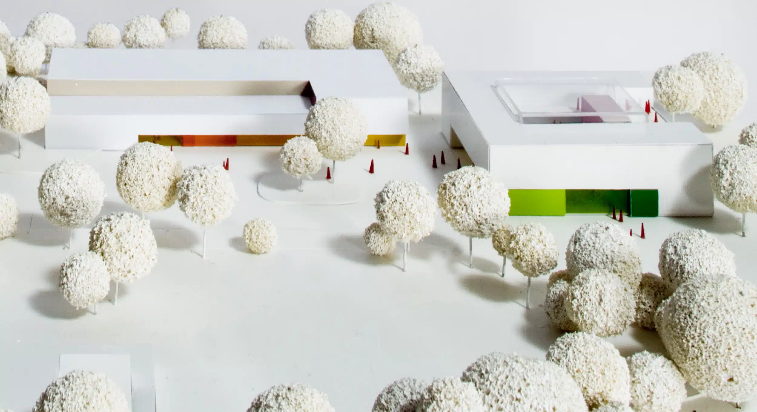 Gebäuderücksprünge, welche die Baukörper akzentuieren und ihnen einen hohen Wiedererkennungswert und Sinnlichkeit geben. Die farbigen Glasfassaden der Schule werden in verschiedenen Punktrastern und Grüntönen emailliert und stellen einen fließenden Übergang ins
